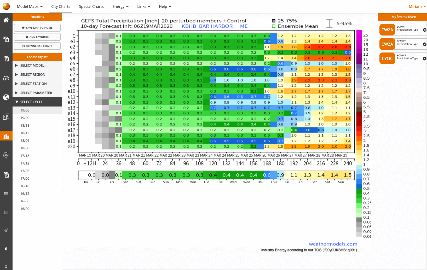Get all kinds of forecast charts for cities. From EPS ensembles precipitation matrices that depict all members at a glance to box plots charts and mixed parameter bar graphs.