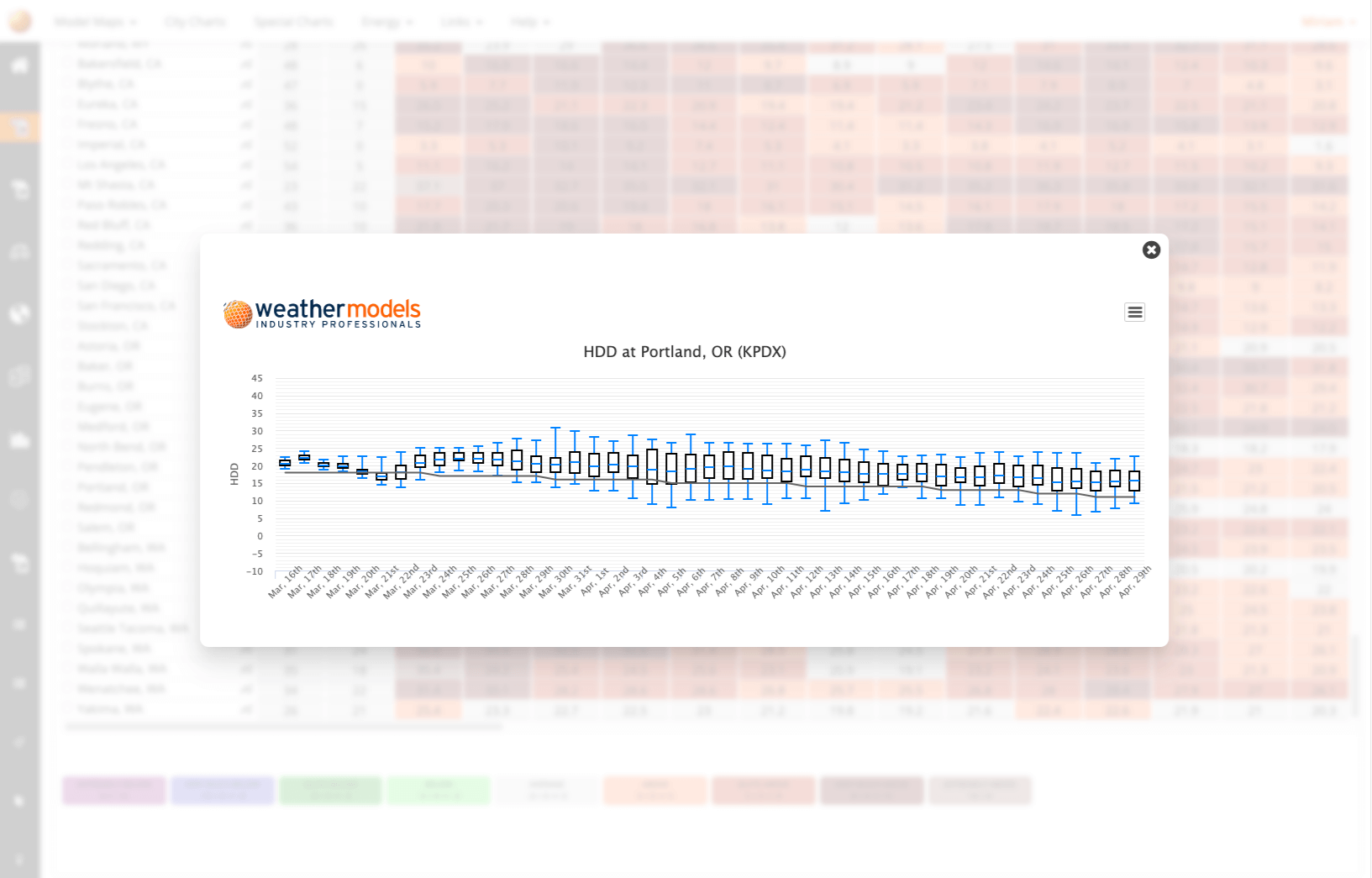 The weathermodels.com Energy Industry Dashboard comes with awesome features like CDD/HDD tables for various models, intuitive graphical displays, and boxplots to enable streamlined handling of our vast data offerings. All of this comes with an affordable price tag.